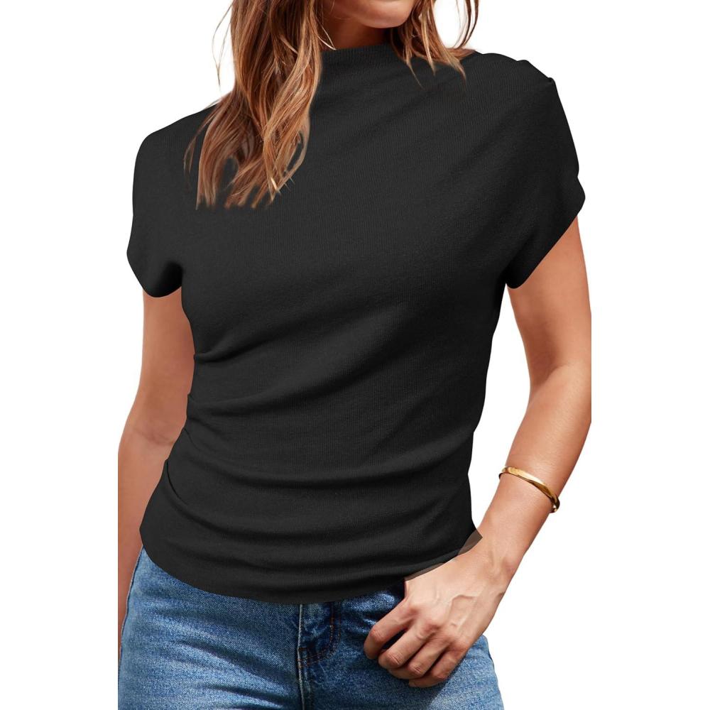 Arach&Cloz Women’s Ruched Summer Tops Mock Neck Cap Sleeve Slim Fit Blouses 2025(Black)