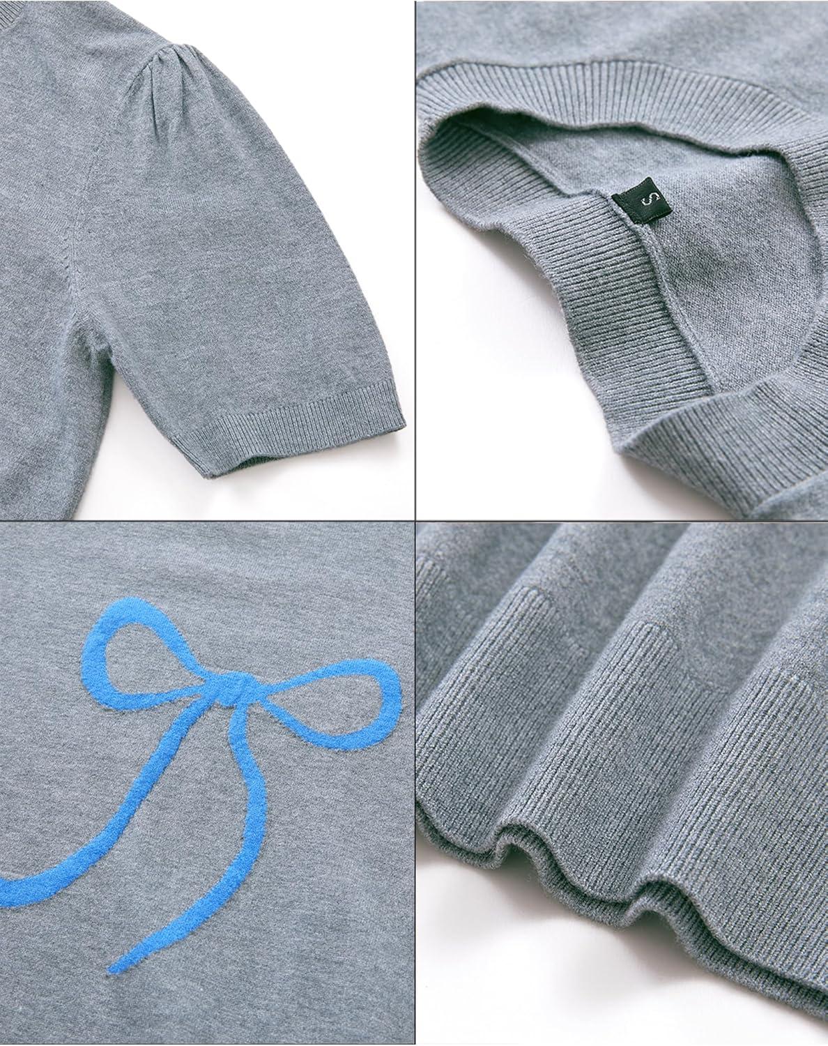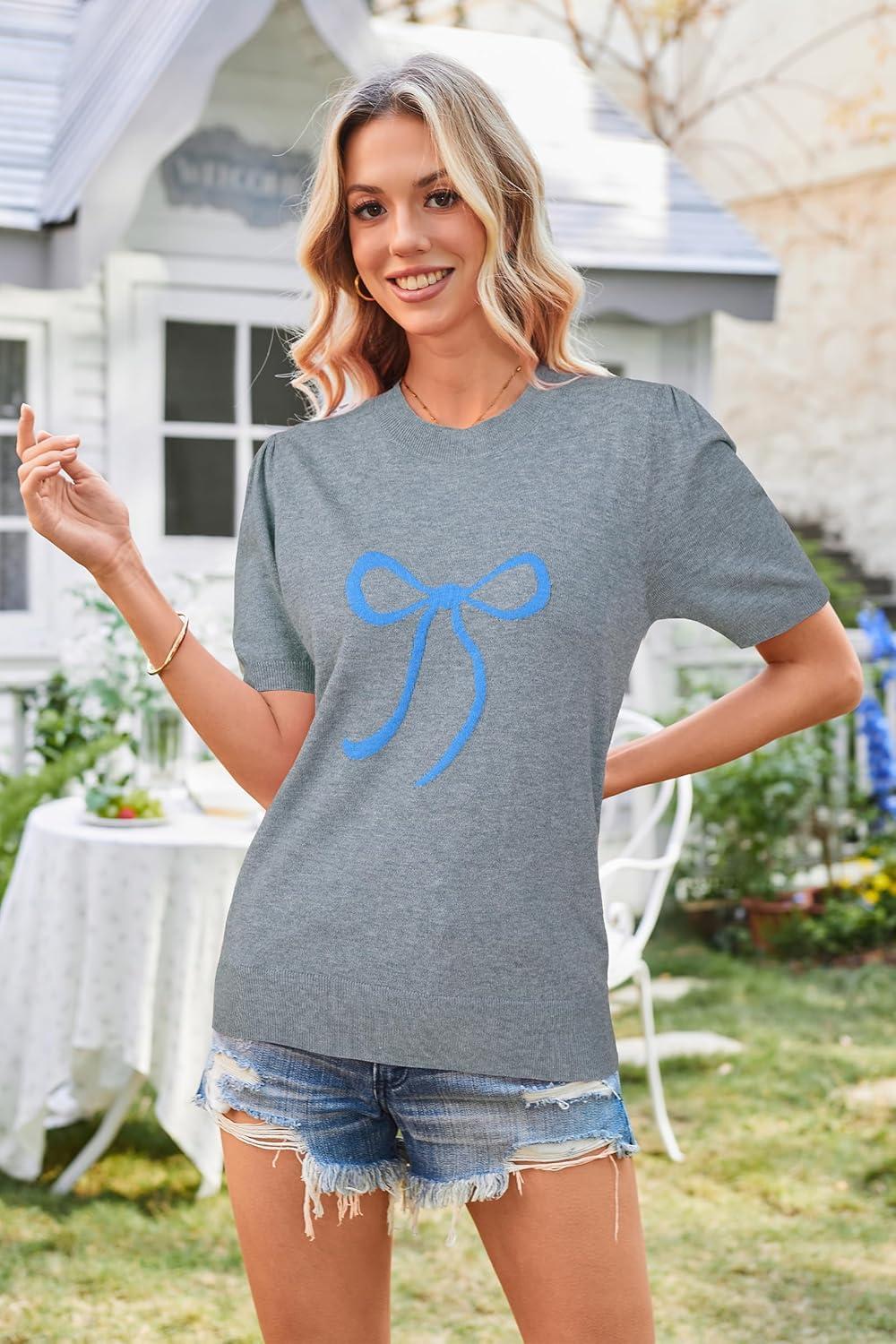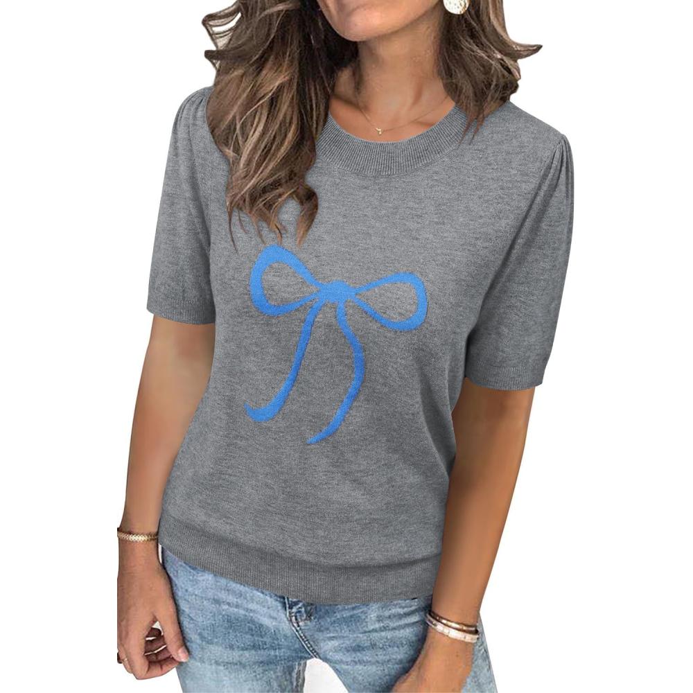 Arach&Cloz Women’s Summer Fall Lightweight Tops Short Sleeve Dressy Blouse(Grey-blue Bow)