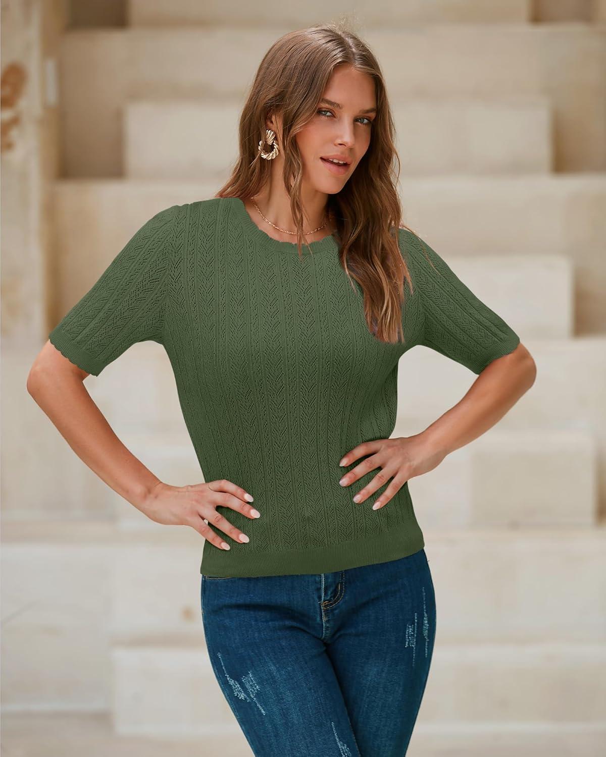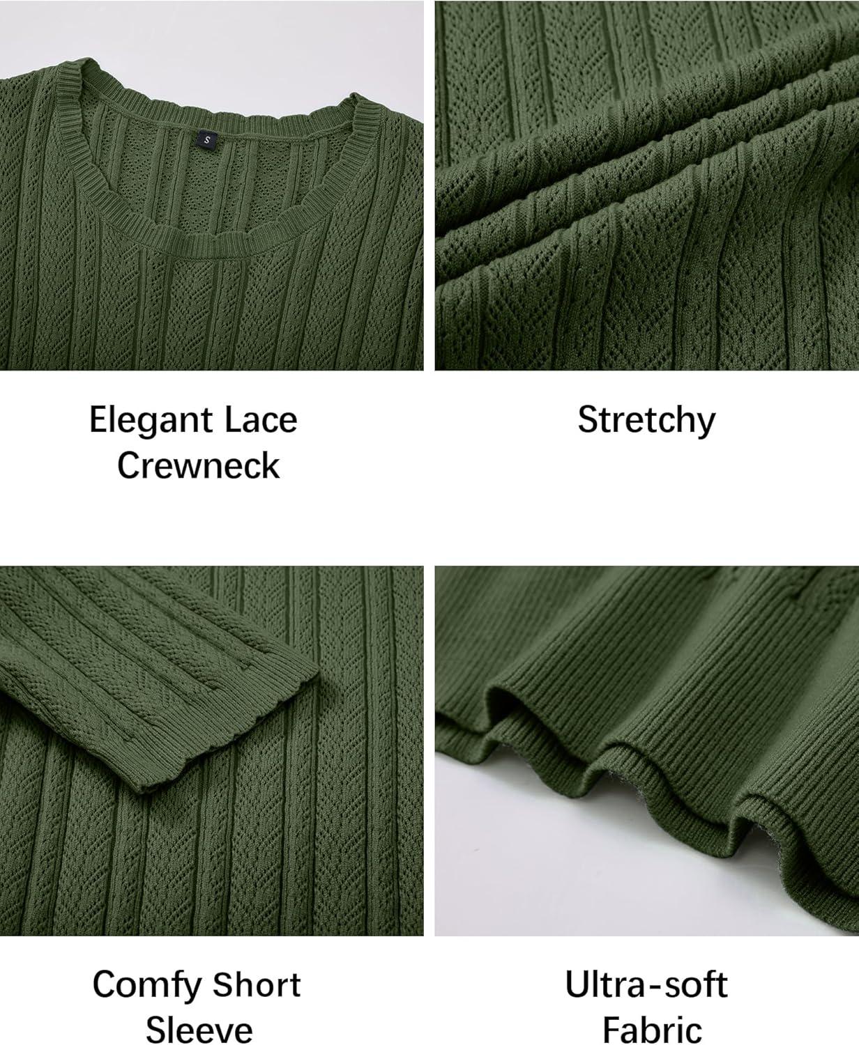 Arach&Cloz Women’s Summer Fall Scalloped Lace Cuff Crewneck Tops Textured Shirts(Army Green)