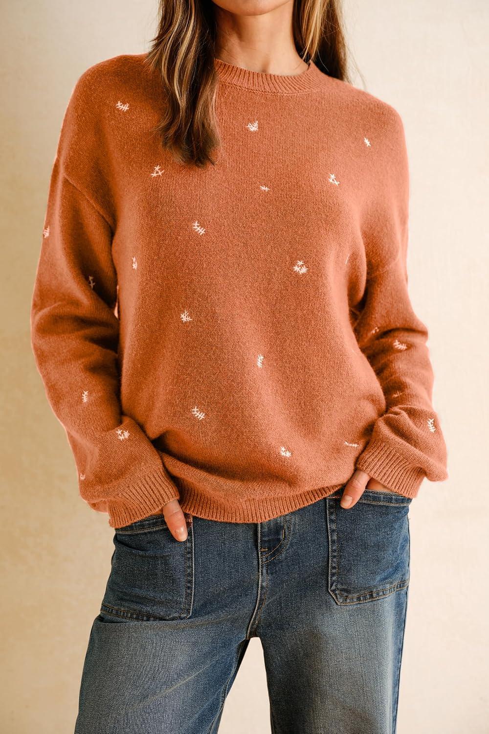 Arach&Cloz Womens Wool Blend Embroidery Floral Oversized Fit Sweater Trendy 2025(Orange)