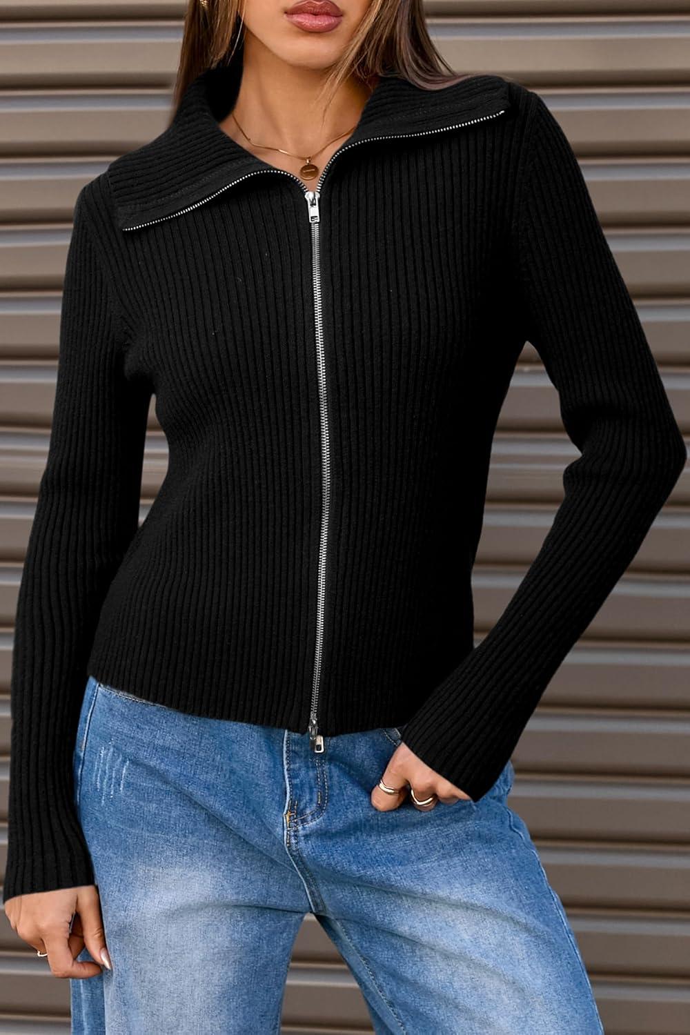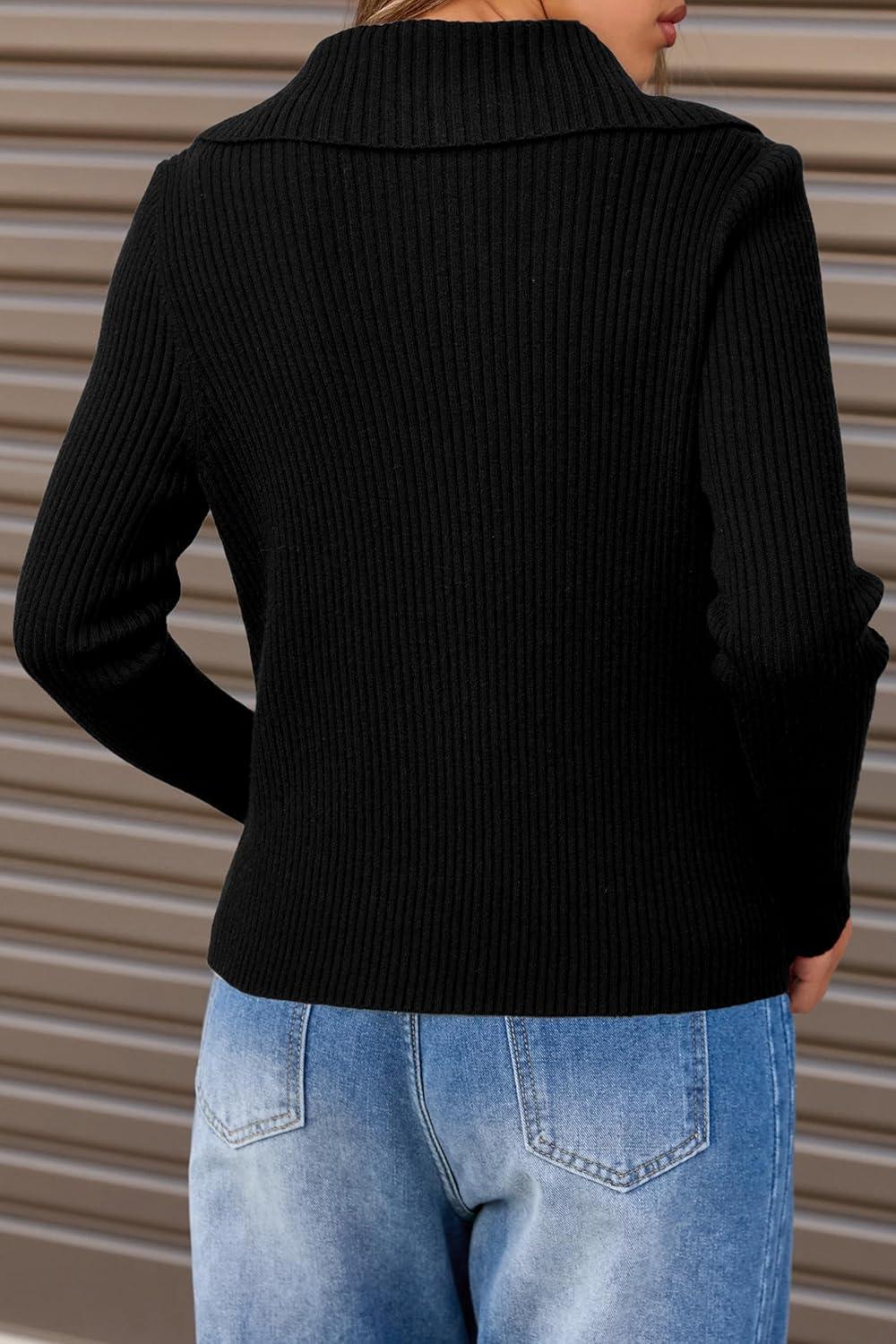 Arach&Cloz Women's Wool Blend Fall Zip Up Lapel Neck Business Cardigan Sweaters 2025(Black)