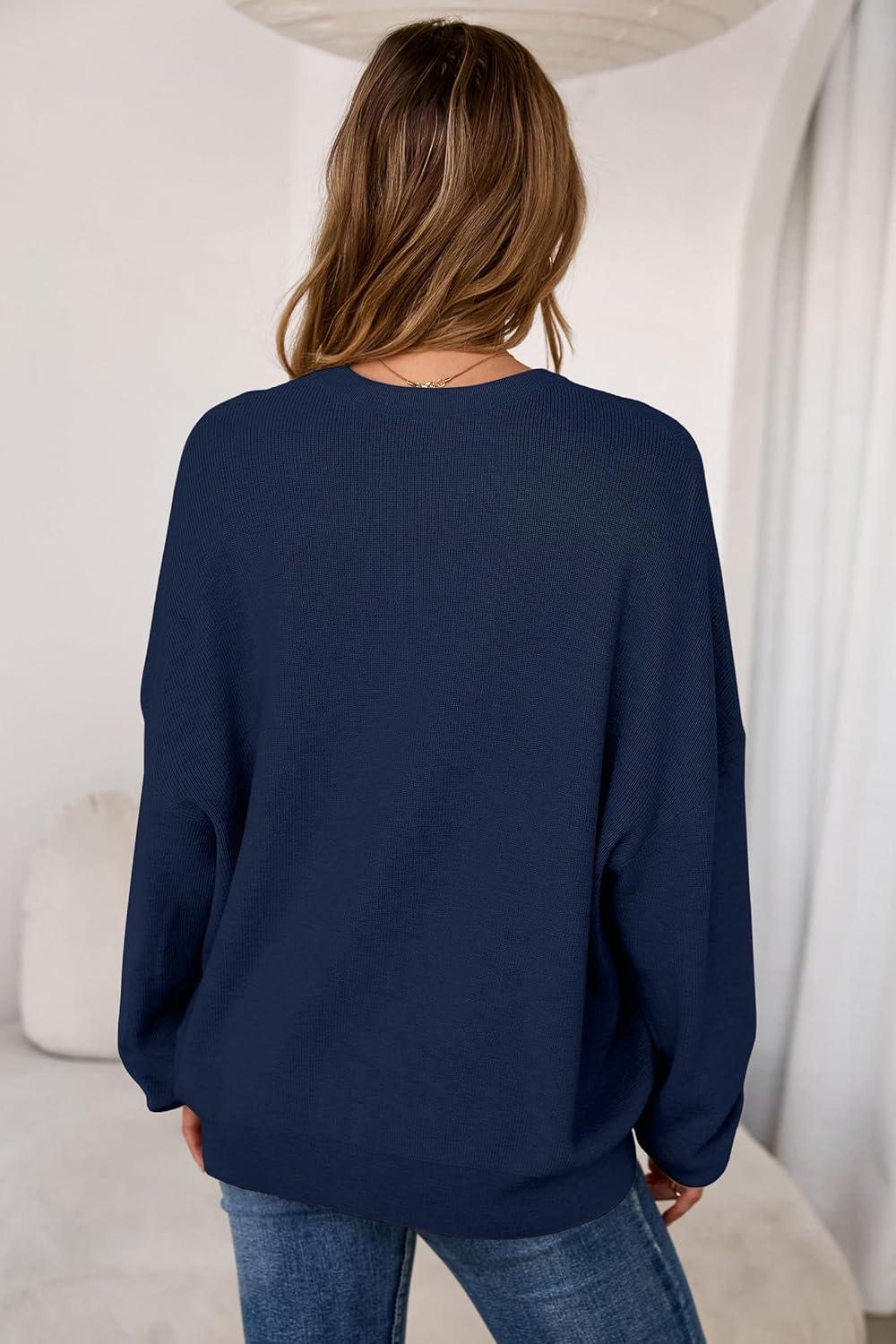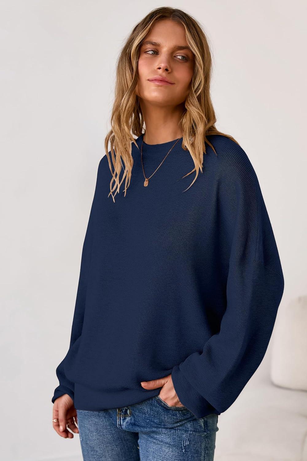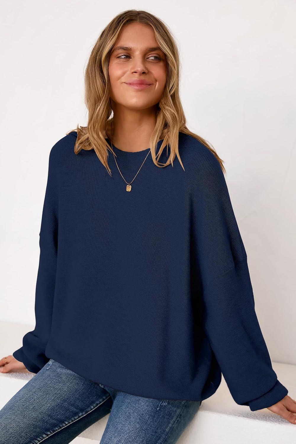 Arach&Cloz Women's Wool Blend Oversized Sweaters Crewneck Casual Fall Outfits Fashion Tops(Navy)
