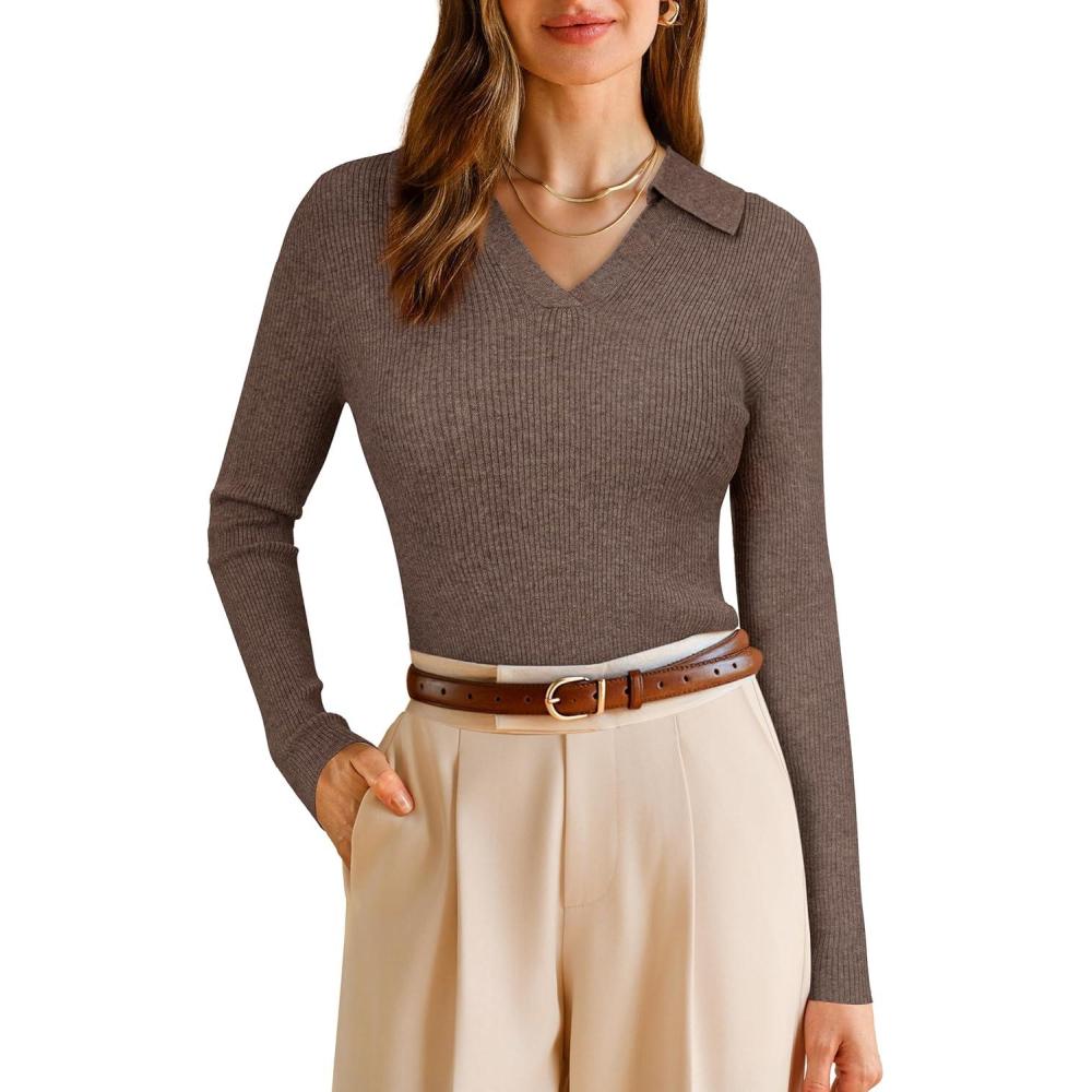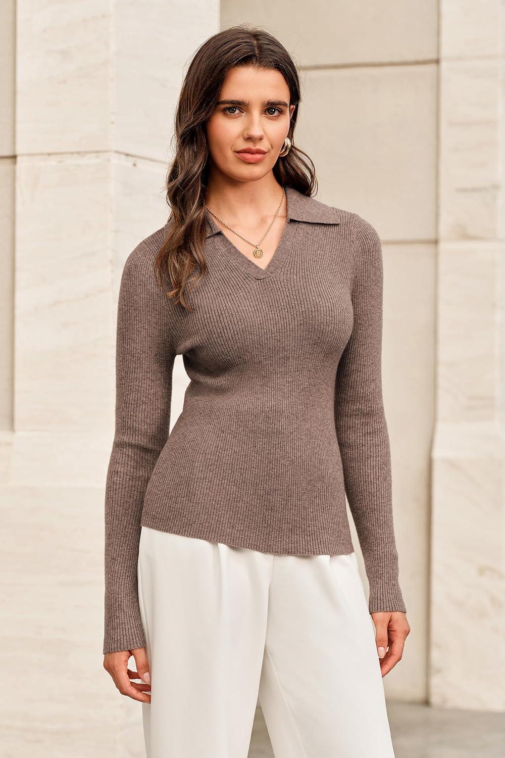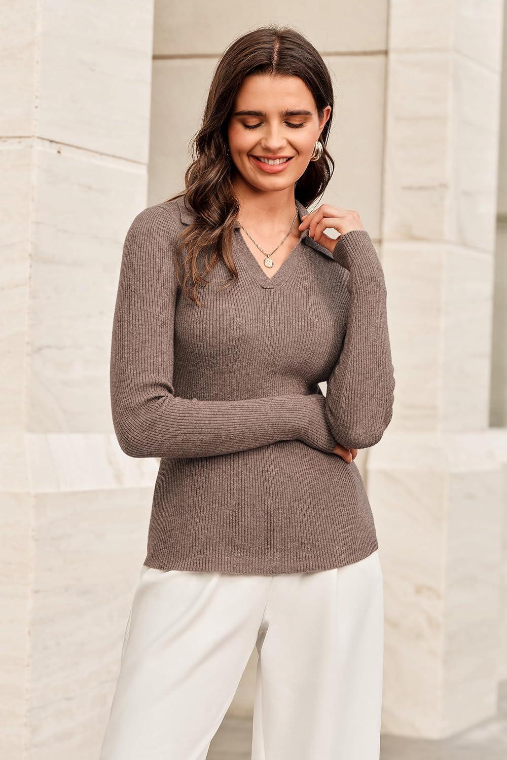 Arach&Cloz Women’s Wool Blend Polo Sweater Shirt Business Casual Slim Fitted Fall Tops 2025(Coffee)