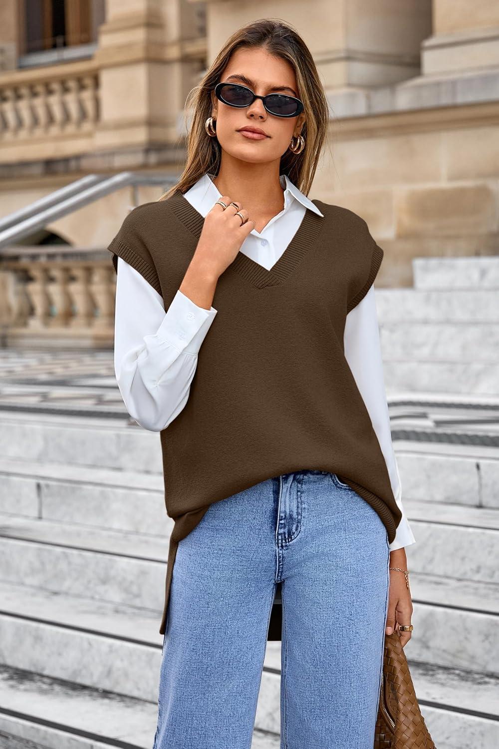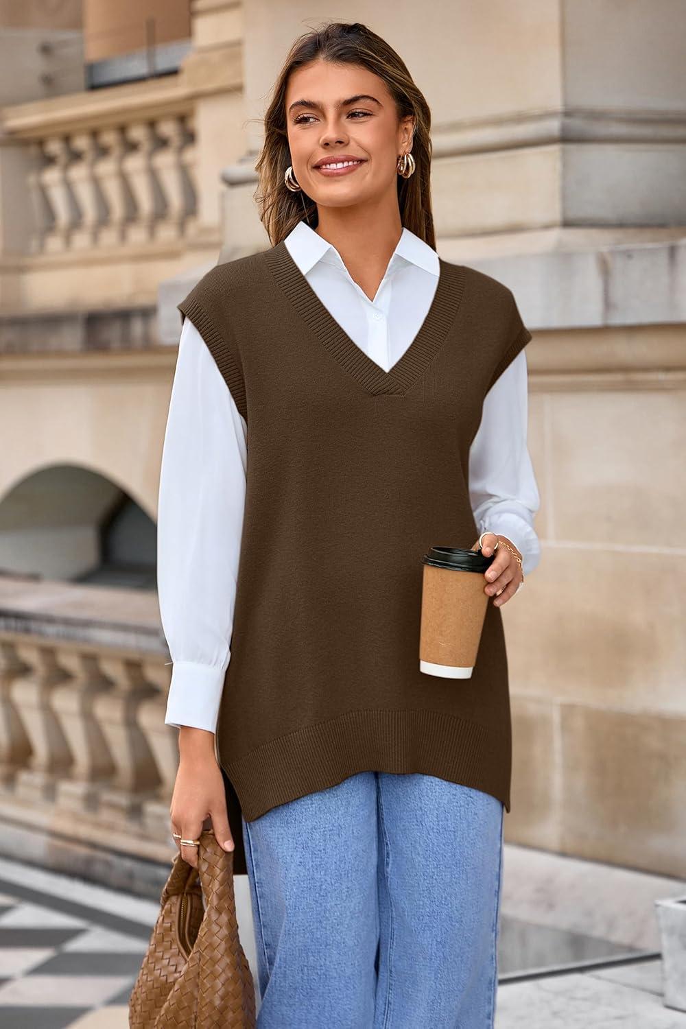 Arach&Cloz Women's Wool Blend Side Slit High Low Versatile V Neck Fall Tunic Sweater Vests 2025(Brown)