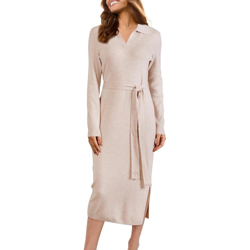 Arach&Cloz Women’s Wool Blend Side Slit Polo Sweater Dresses 2025 Fall Business Casual Outfits(Beige)