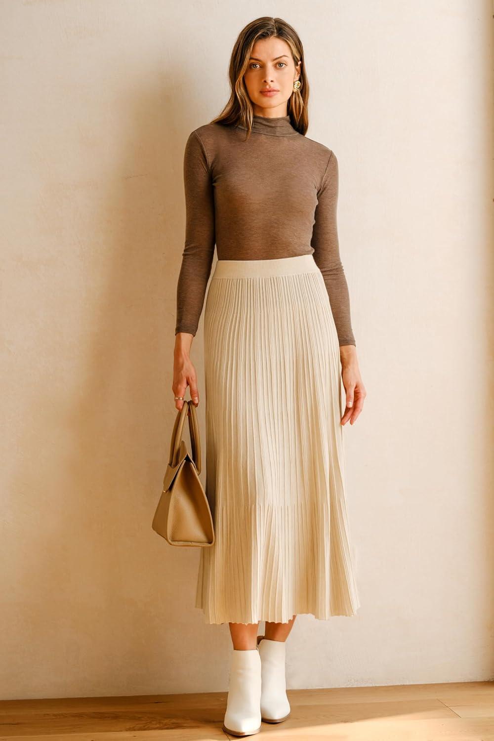 Arach&Cloz Women’s Wool Blend Wide Elastic Band A-Line Pleated Flowy Long Skirts 2025(Apricot)