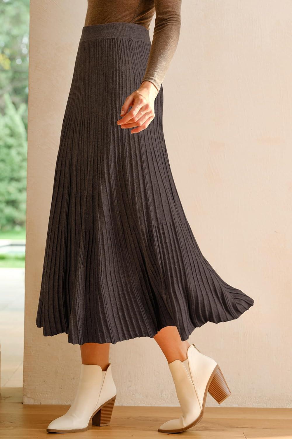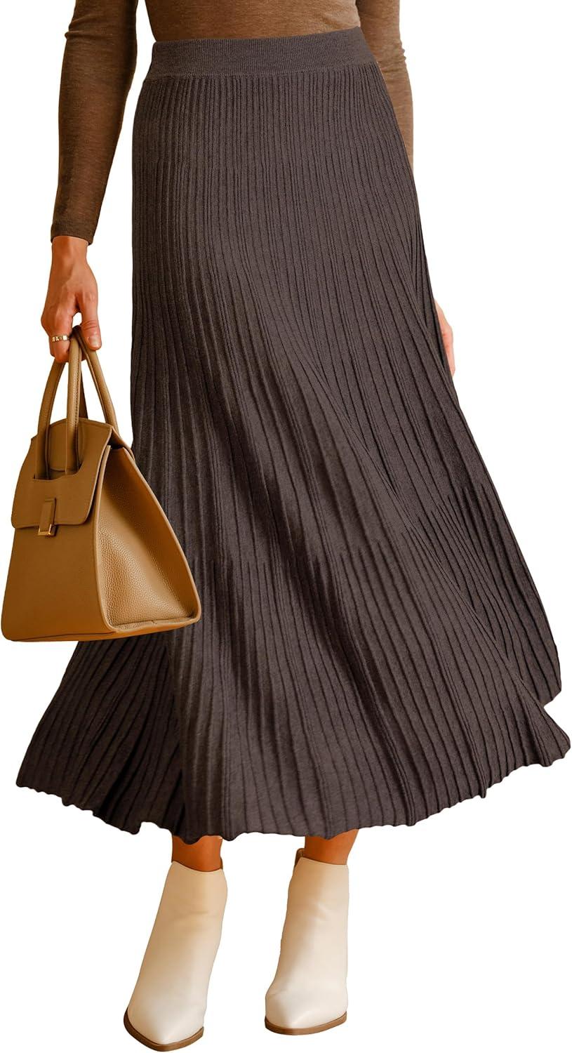 Arach&Cloz Women’s Wool Blend Wide Elastic Band A-Line Pleated Flowy Long Skirts 2025(Coffee)